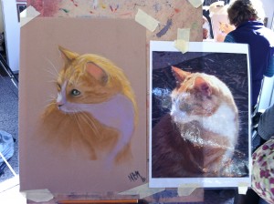 Last weekend was brilliant – I went to the SAA ‘Its All About Art’ live event in Bristol, which was fantastic! Along side a vast array of art materials, books, dvd’s and every possible arty gadget you can imagine for sale, there were lots of professional artists demonstrating all sorts of different media and offering workshops to those of us wanting to try something new. With the majority of my own paintings being birds painted in acrylic, I decided to reach out of my comfort zone and headed for pastel and watercolour. My 1st port of call was to Vic Bearcroft, who’s workshops I attended at last years event. Vic is an award winning artist – his pastel paintings simply blow me away! Even though I’ve seen him paint, it still amazes me how he can create such fine, soft detail of animal fur using soft pastels. Having said that, Vic is also very good at sharing his art with a straight forward, easy to follow step by step workshop, where he clearly explains how he creates his paintings building up layers of pastel from a sketched outline, tonal sketch, blocking in, then final detail with contrast & highlight. I took some photos of the various stages as I worked on his picture of a ginger cat.