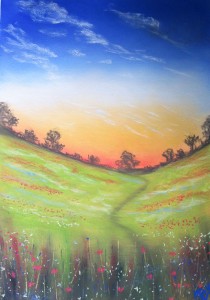 Pastels are very different to the acrylic paints I normally use!! Its a whole new technique learning how to apply them. They are dusty and your fingers get filthy and although the velour paper is beautiful…you have to be really careful and try not to get finger prints everywhere!! I’m glad you like what I’ve done…I’m pleased too, its just I have to concentrate really hard and think about every move I make – not quite as relaxing as painting with paint!!!! I’m sure with practice it will get easier…so I am practising like mad. I’m pretty sure Mum picked you up a leaflet with some ‘how tos’ in showing how its done, so you can have a try as well. I hope you enjoy having a go,