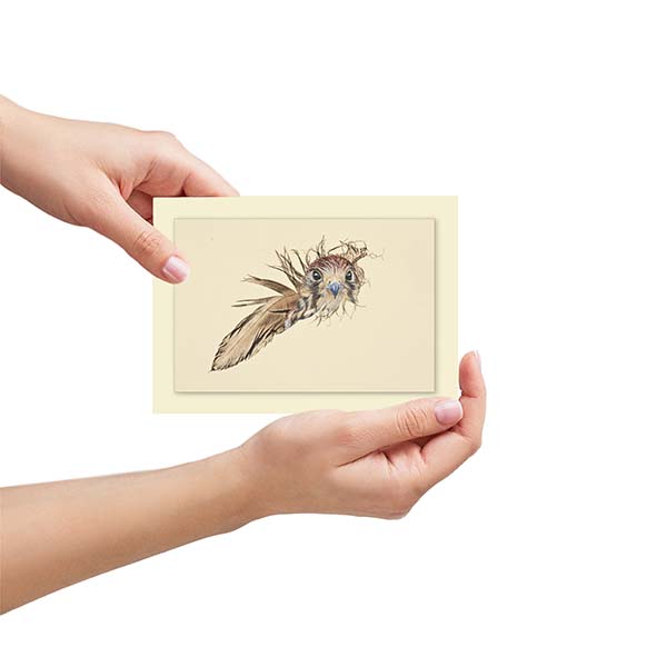 Hand made greetings card, 7″ x 5″ from an original artwork ‘Epitome Of Beauty’ showing a Kestrel painted on a feather by The Feather Lady.