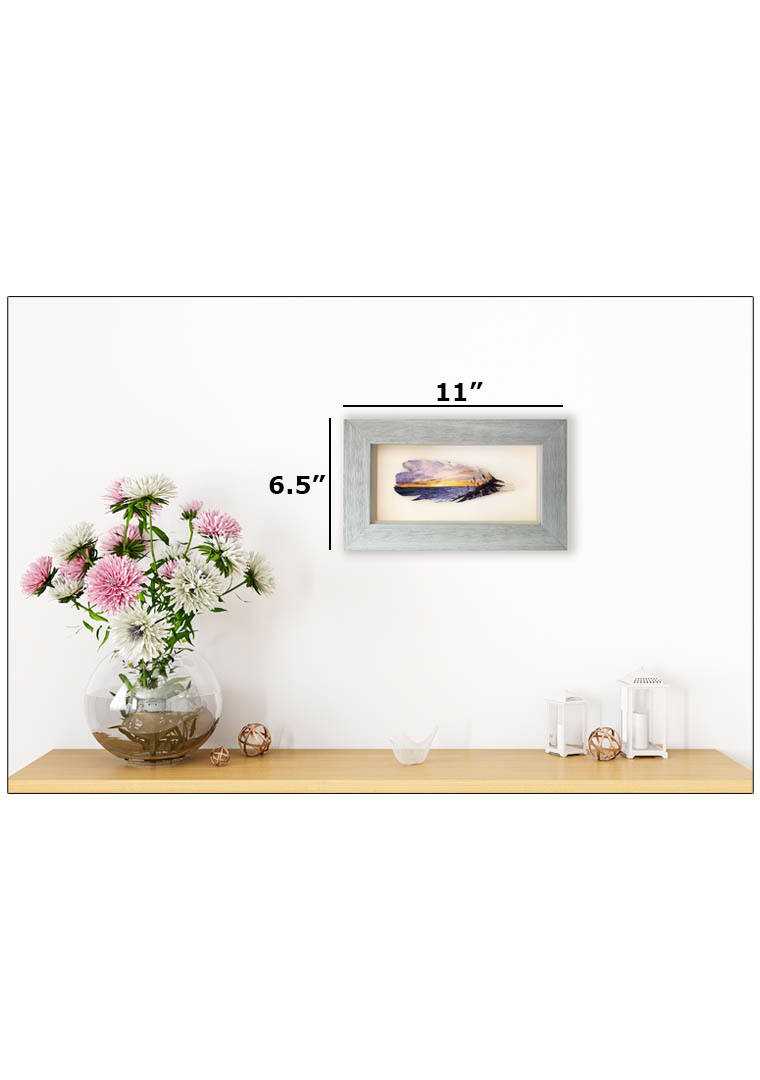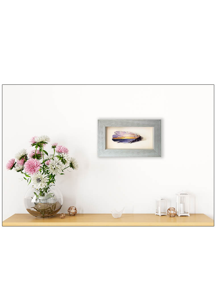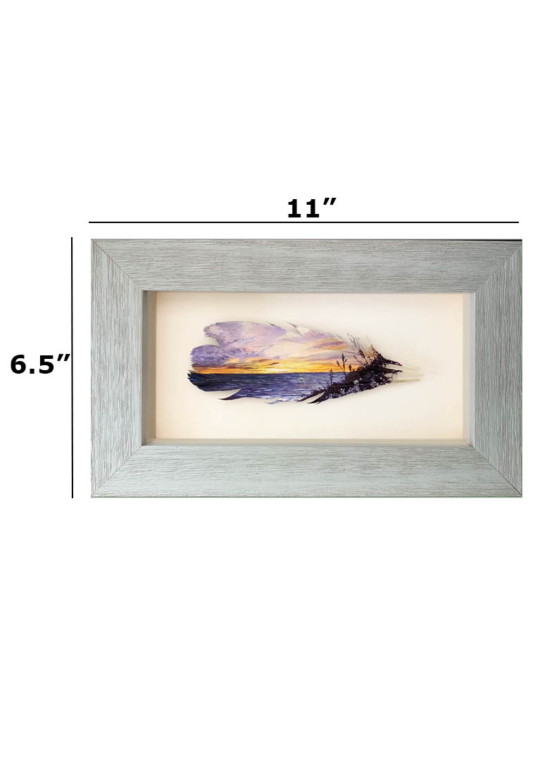The beautiful Sunset Seascape painting on naturally moulted feathers is mounted on a neutral background to accentuate the vibrant colours of this evening scene.