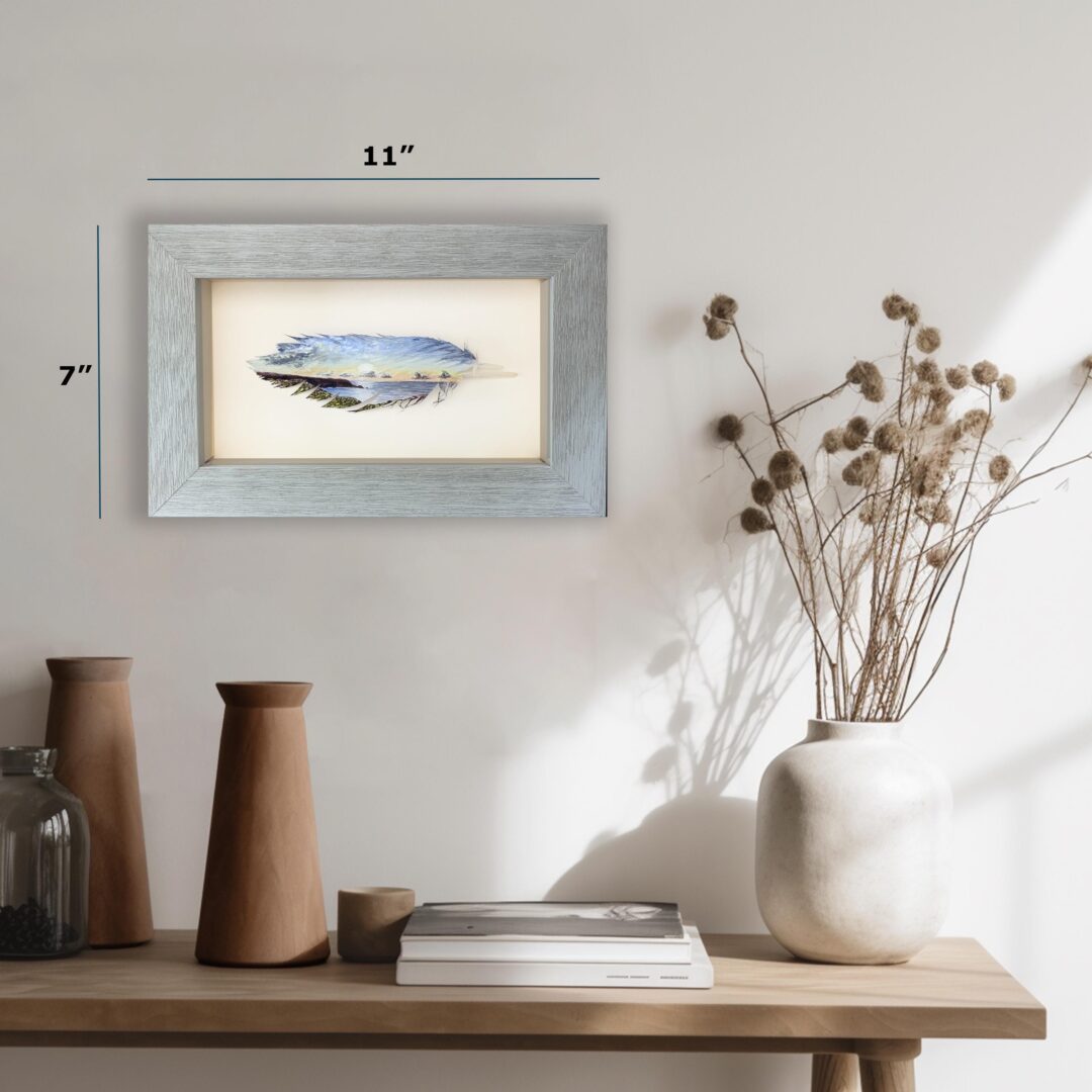 The beautiful Sunset Seascape painting on naturally moulted feathers is mounted on a neutral background to accentuate the subtle colours of this evening scene.